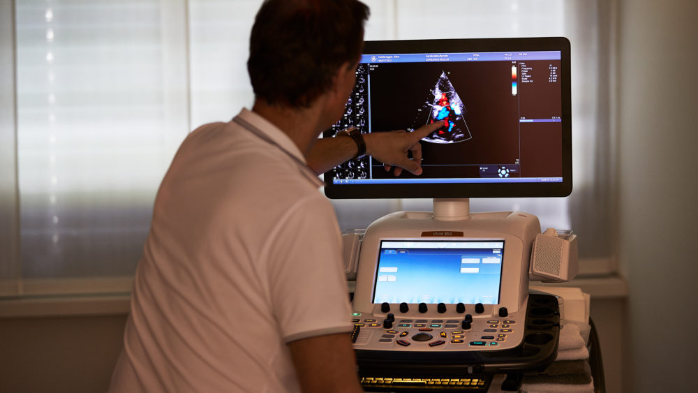 Die Echokardiographie ist eine Ultraschalluntersuchung des Herzens und ist heute eine Routineuntersuchung in der Kardiologie. Mit der Echokardiographie können alle Herzkammern, die 4 Herzklappen und der Herzmuskel mit seinen angrenzenden Strukturen dargestellt werden. Neben der Struktur kann sowohl die Funktion der Herzkammern wie auch der Herzklappen gemessen werden. Die Untersuchung erfolgt im Liegen mit einem Ultraschallkopf, welcher auf der linken Seite des Brustkorbes aufgesetzt wird. Die Untersuchung ist schmerzlos und ungefährlich.